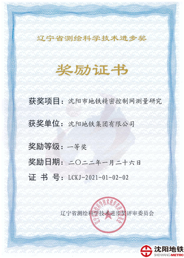 沈阳市地铁精密控制网测量研究项目荣获辽宁省测绘科学技术进步一等奖
