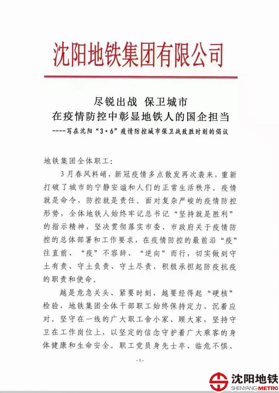 针对当前沈阳市新冠疫情的严峻形势,集团工会迅速行动、立即部署,第一时间向集团全体职工发出《尽锐出战 保卫城市 在疫情防控中彰显地铁人的国企担当》倡议书,号召广大职工坚定信心、保持定力、沉着应对,积极响应“保卫自己、保卫城市”号召,自觉遵守防疫要求,主动配合完成各项疫情防控工作,加强个人防护,确保身心健康。牢记地铁人的初心使命,切实增强紧迫感、责任感,广大党员干部身先士卒、冲锋在前,职工群众奋勇而上,以时不我待的精神和奋勇争先的先锋姿态,彰显“咱们工人有力量”,为打赢这场疫情防控歼灭战贡献“地铁力量”。同时,要求各级工会组织要迅速动员、强化宣传教育、做好员工思想引导,切实当好职工“娘家人”,为广大职工排忧解难并做足服务保障,切实保障职工队伍平安,为广大战斗在抗疫一线的职工提供最坚实的保障。