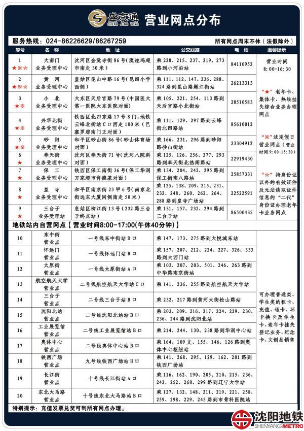 为深化“我为群众办实事”主题实践活动,进一步优化营商环境,满足市民退卡便利服务需求,在全市可直接办理盛京通卡退卡业务的20处网点基础上,自2021年11月1日起,沈阳地铁全线91处车站乘客服务中心均开通代办盛京通普通消费卡、关爱卡、夕阳红卡退卡业务,全市可办理或受理退卡业务的点位达到111处。